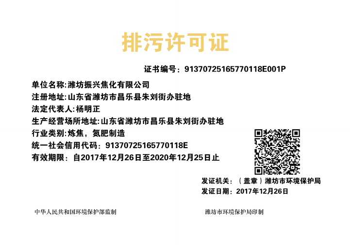 頒發排污許可證,讓企業持證排污、自證守法是“十三五”期間國家推行的一項重要環保舉措,排污許可證將是企業排污行為的行政許可和接受環保部門監督的重要法律文書。經過近一個月的共同努力,振興焦化公司終于如期完成了環保排污許可證的辦理工作,12月26日,環保排污許可證順利發放,為正常的生產經營工作提供了有力保障。
