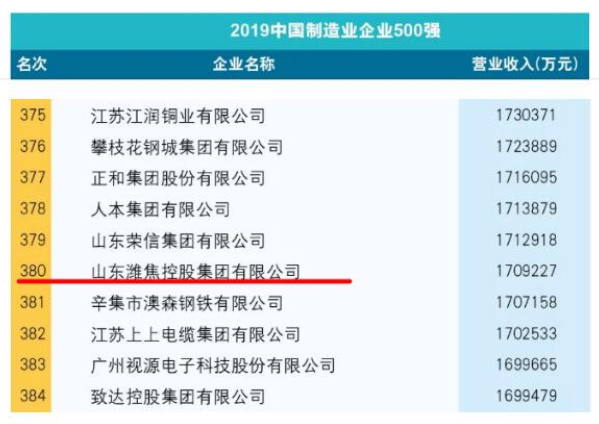 近日,在2019中國500強(qiáng)企業(yè)高峰論壇上,中國企業(yè)聯(lián)合會、中國企業(yè)家協(xié)會聯(lián)合發(fā)布了“2019中國制造業(yè)企業(yè)500強(qiáng)”榜單,山東濰焦控股集團(tuán)有限公司再次榮登榜單,位列中國制造業(yè)企業(yè)500強(qiáng)第380位,比去年提高了一個(gè)位次。