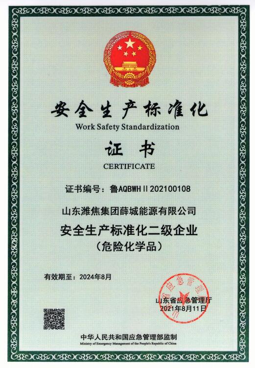 2021年7月,棗莊市應急管理局組織安全標準化考評專家組,對公司二級安全標準化進行評審驗收。按照安全生產標準化評審標準,評審了公司安全生產目標、機構與職責、安全教育培訓、安全生產投入、安全管理制度與操作規程、生產設備設施、作業安全、職業健康管理、事故與應急和危險化學品管理等12個要素。通過資料審查、現場檢查、人員詢問等方式對公司立體化評審。經評審,公司安全生產標準化運行情況良好,得到了專家組的一致好評,順利通過評審。