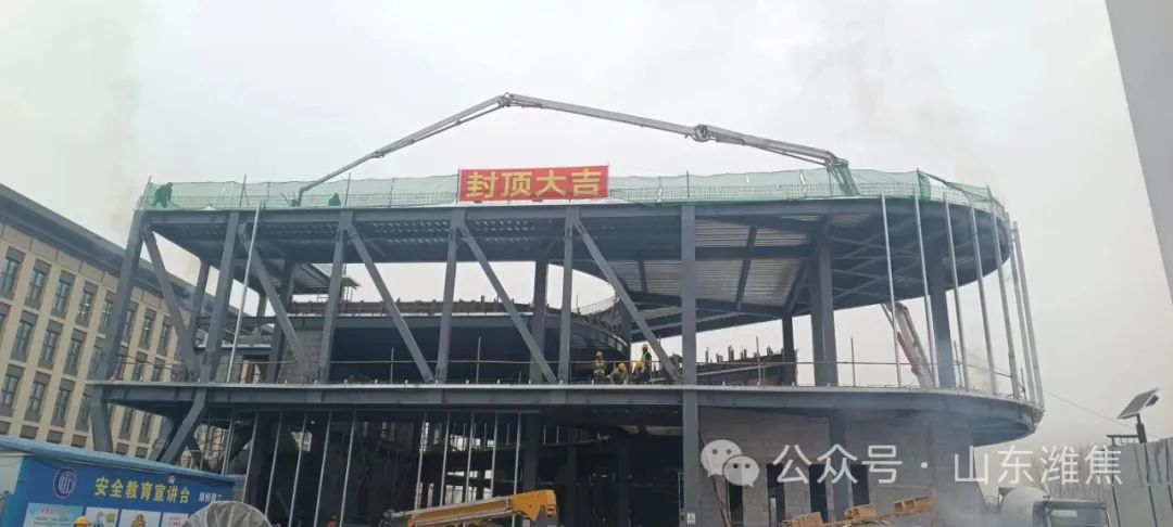 11月16日,伴隨著一車(chē)混凝土澆筑的完成,濰焦文化中 心項(xiàng)目經(jīng)過(guò)72天爭(zhēng)分奪秒日夜奮戰(zhàn),主體架構(gòu)順利封頂。