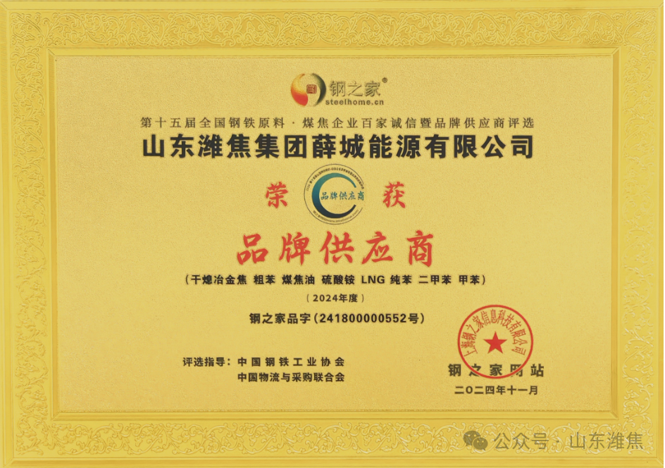 近日,“鋼之家第十五屆全國鋼鐵原料·煤焦企業百家誠信暨品牌供應商”評選活動順利舉行,經鋼之家網站征信取證,中國鋼鐵工業協會及中國物流與采購聯合會專家評審,薛城能源公司被評為2024年度“品牌供應商”殊榮。